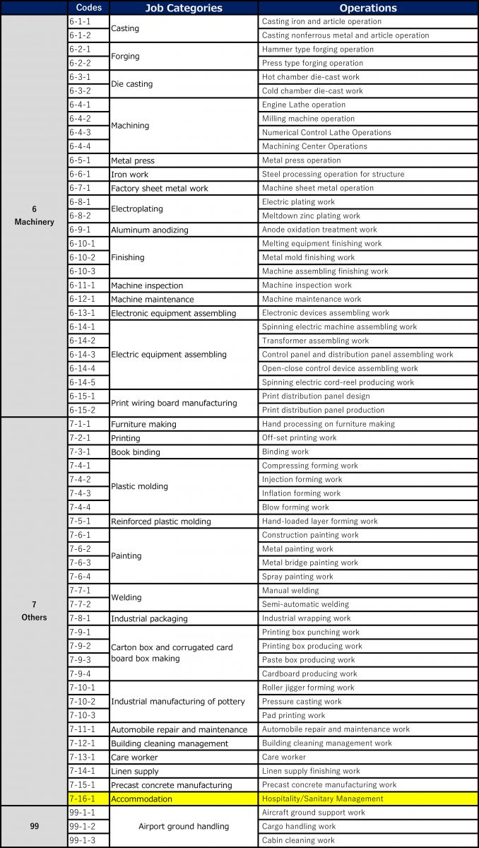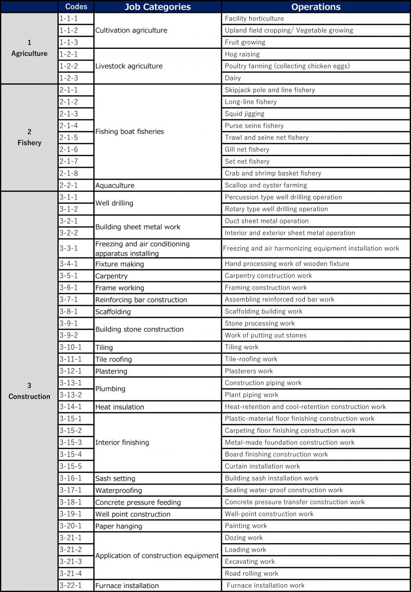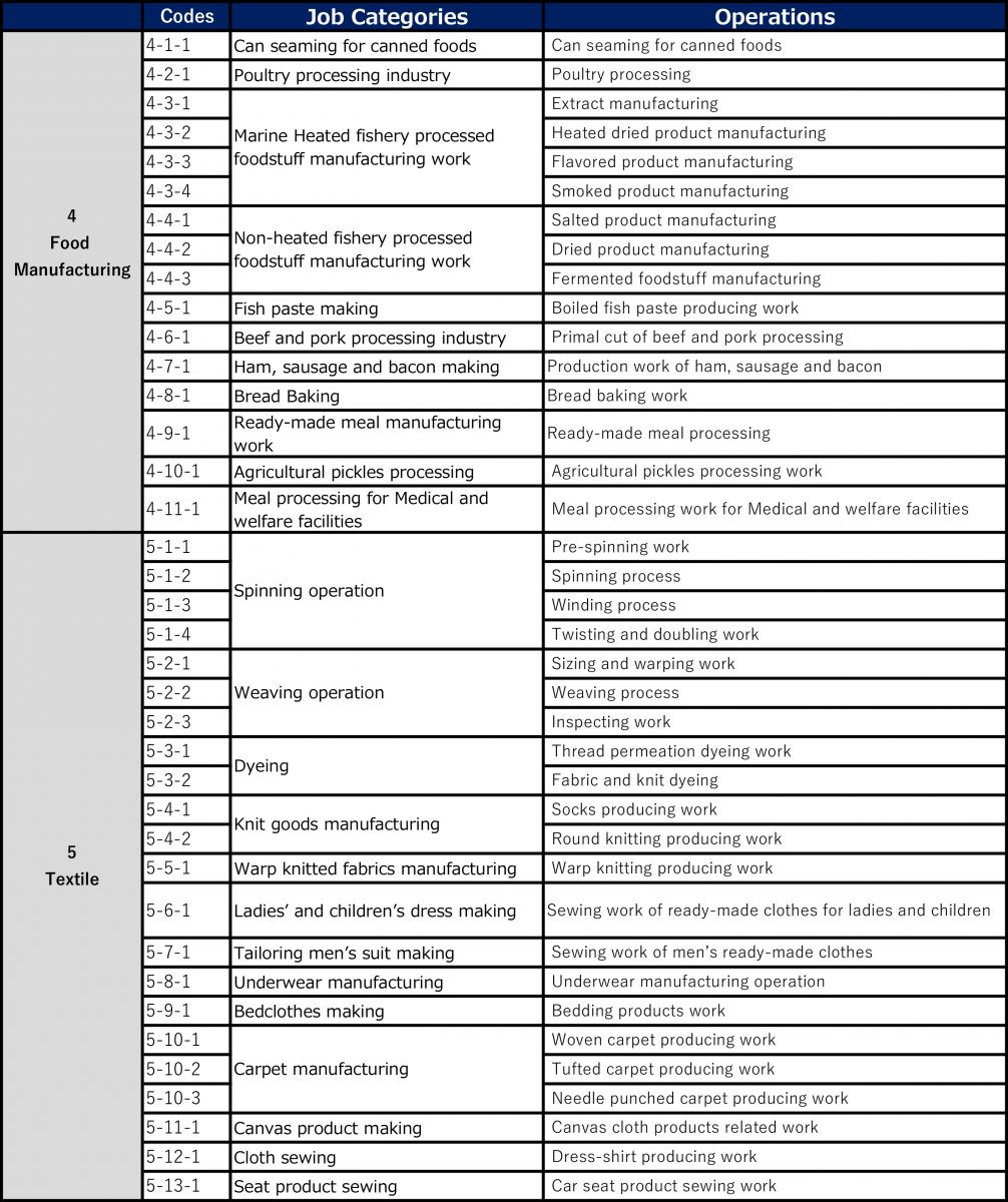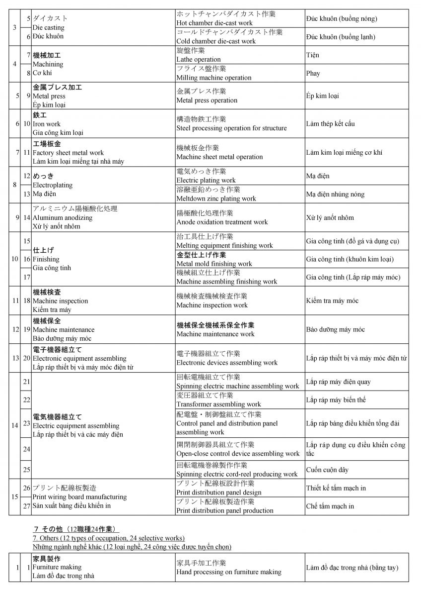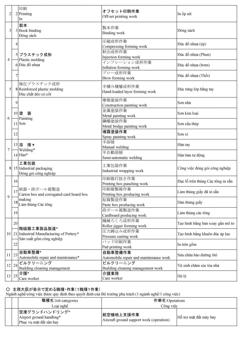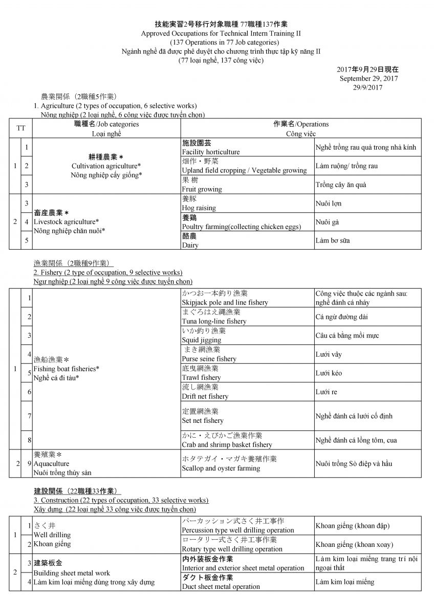 Các ngành nghề Thực tập kỹ năng tại Nhật Bản từ 29/9/2017 (cập nhật 17/07/2020)